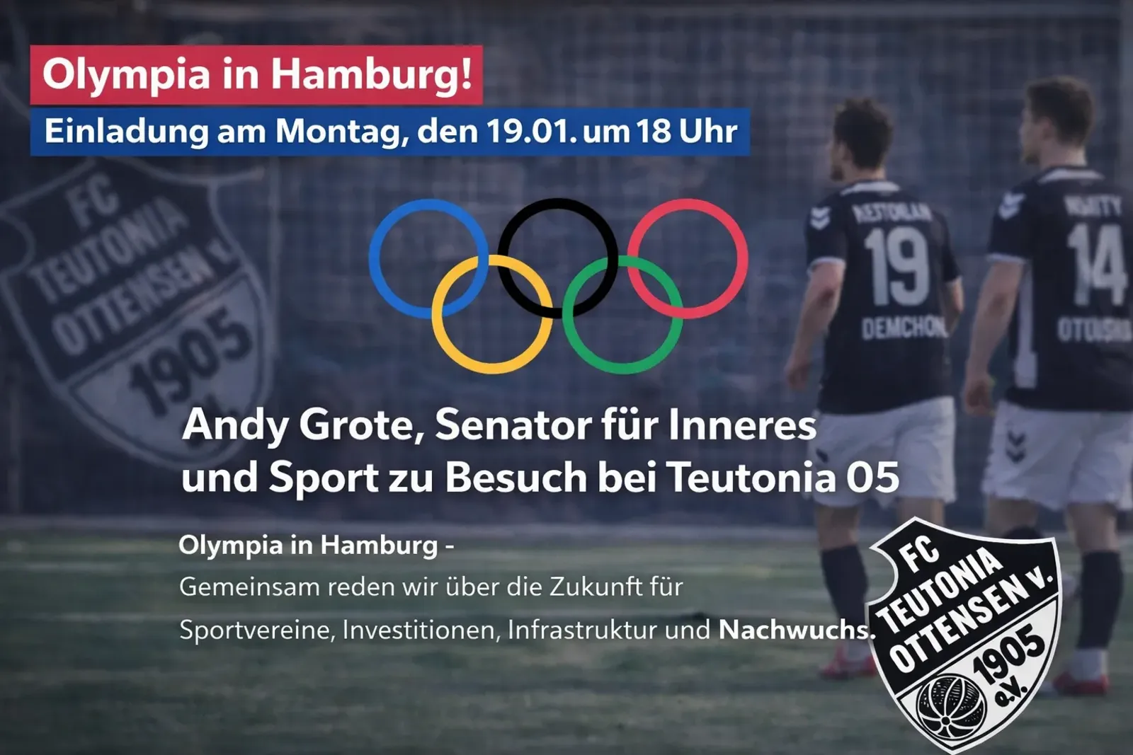 Der Fußballverein Teutonia 05 lädt am Montag den 19. Januar um 18:00 Uhr zu einer Diskussionsveranstaltung mit Hamburgs Innensenator Andy Grote ins Vereinsheim ein. Thema des Abends sind die Perspektiven einer möglichen Olympiabewerbung Hamburgs sowie die Frage, wie Hamburger Sportvereine konkret von Olympia profitieren können.